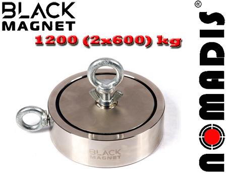 je obojestranski neodim magnet z največjo natezno silo 2 x 600 kilogramov . Black Magnet F600x2 je sestavljen iz dveh magnetov, tako da je moč magneta v vsakem primeru usmerjena v dno, kar poveča možnost ulova. V kompletu sta z dvostranskim Black Magnet magnetom priložena dva očesna vijaka – za vodoravno ali vertikalno vleko magneta.